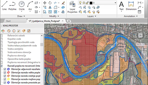 River body Ljubljanica Moste - Podgrad with river flooding stages from Water cadastre, Slovenian Water Agency. City Medvode, building cadastre, land cadastre, real estate register, public infrastructure, cultural heritage, running waters and flooding. Technical database with spatial and network topology